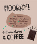 Our 70% Cacao Organic Dark Chocolate Bar with Arabica Coffee is free from peanuts, tree nuts, gluten, wheat, soy, dairy, sesame, refined sugar, palm oil, and emulsifiers.